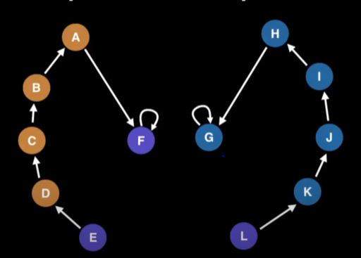 일반적으로 E 노드의 ROOT를 찾기 위해서는 D-C-B-A-F 이렇게 가야하고, L 도 마찬가지 이지만
